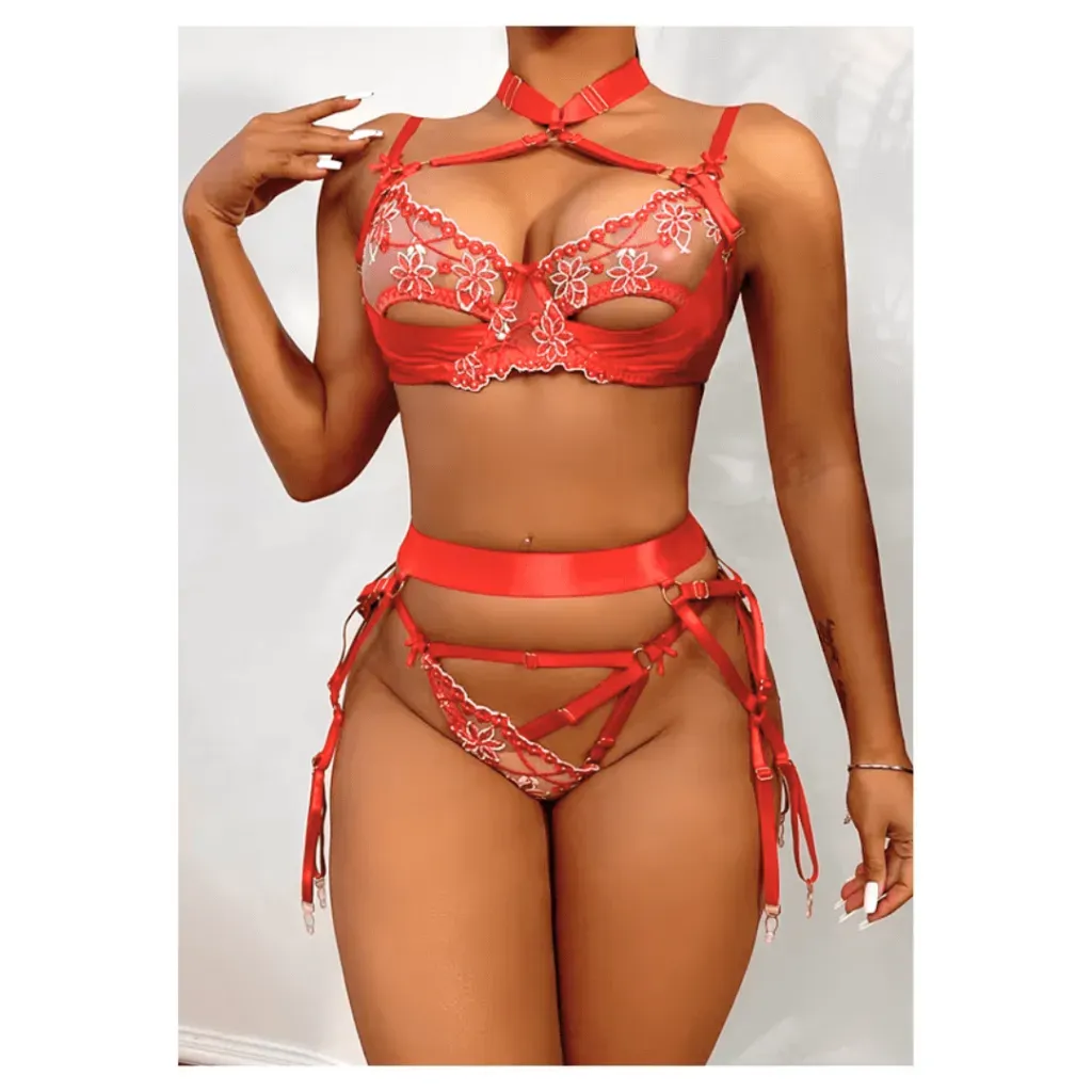 Despierta tus sentidos con este set de lencería de talla estándar, irresistiblemente sensual. Los delicados encajes y las elegantes ligas te envolverán en una sensación de confort y lujo. Su diseño elástico se adapta a tu cuerpo a la perfección, realzando tus curvas con suavidad.