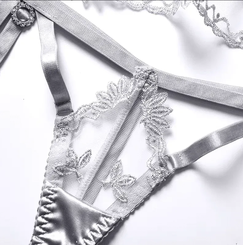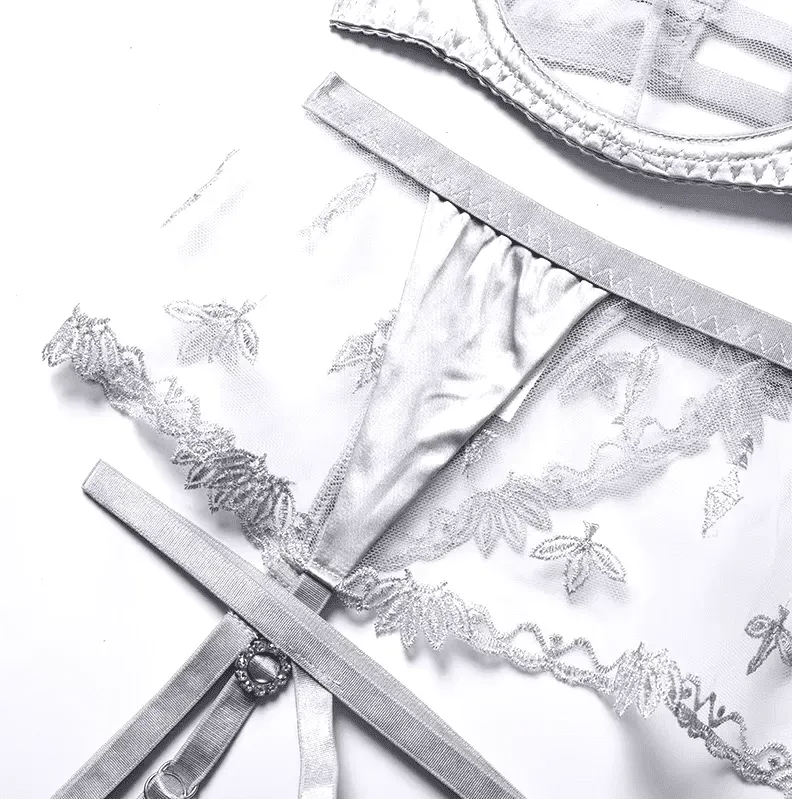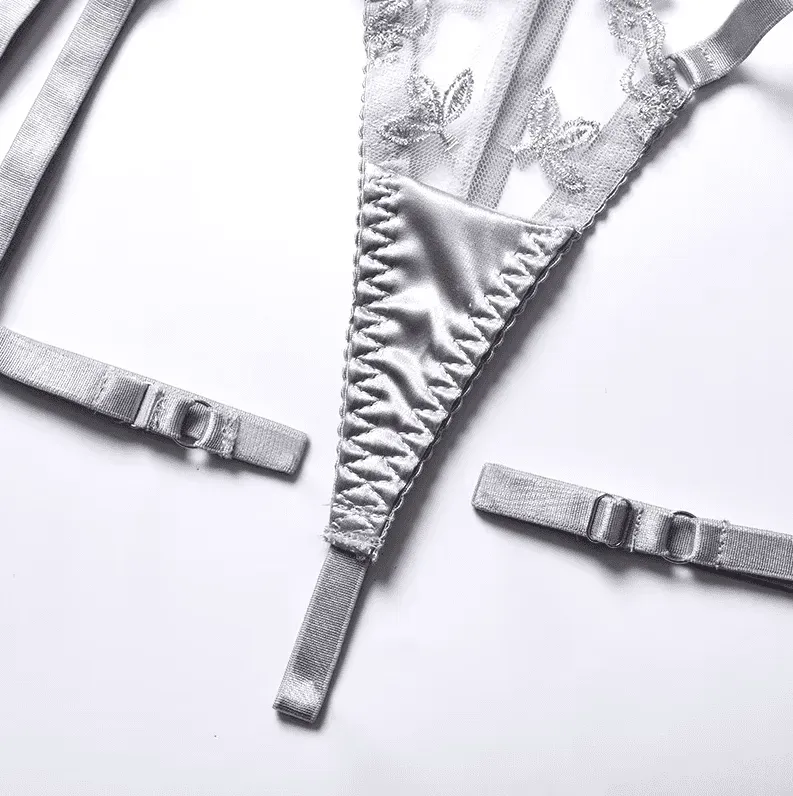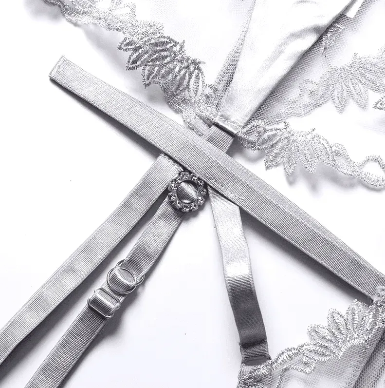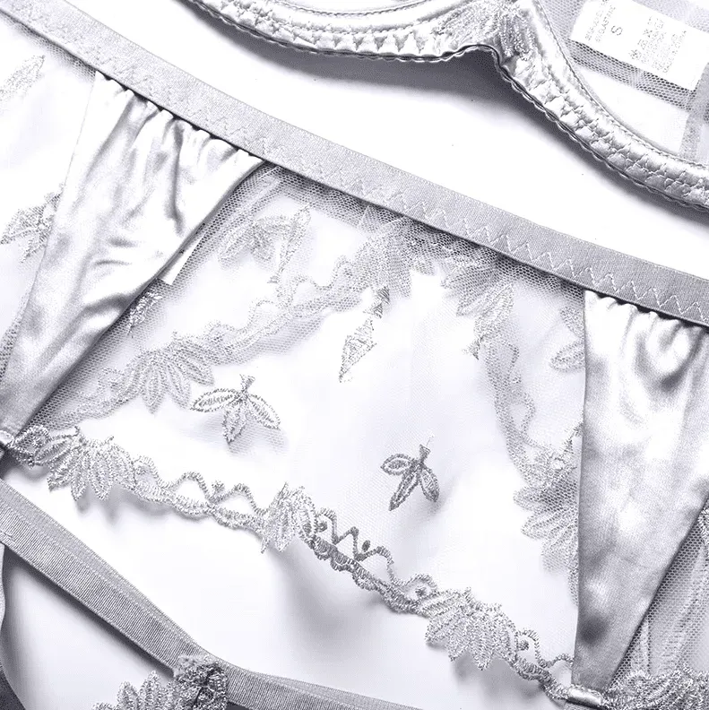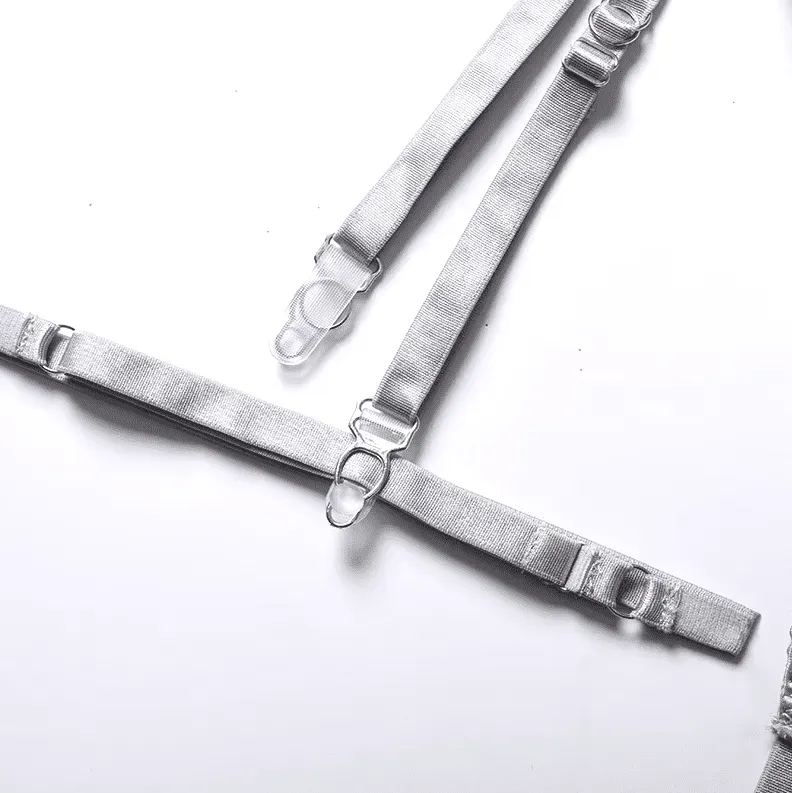 Despierta tus sentidos con este set de lencería de talla estándar, irresistiblemente sensual. Los delicados encajes y las elegantes ligas te envolverán en una sensación de confort y lujo. Su diseño elástico se adapta a tu cuerpo a la perfección, realzando tus curvas con suavidad.