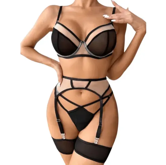 Despierta tus sentidos con este set de lencería de talla estándar, irresistiblemente sensual. Los delicados encajes y las elegantes ligas te envolverán en una sensación de confort y lujo. Su diseño elástico se adapta a tu cuerpo a la perfección, realzando tus curvas con suavidad.